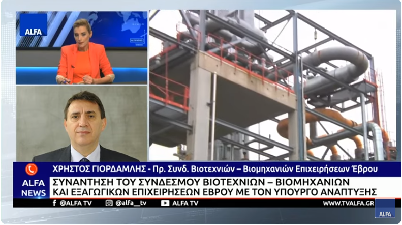 Στο κεντρικό δελτίο ειδήσεων του τηλεοπτικού σταθμού ΑΛΦΑ ΤΗΛΕΟΡΑΣΗ ΒΟΡΕΙΟΥ ΕΛΛΑΔΟΣ φιλοξενήθηκε ο Πρόεδρος του Συνδέσμου Βιοτεχνιών - Βιομηχανιών και Εξαγωγικών Επιχειρήσεων Έβρου, κ. Χρήστος Γιορδαμλής, ο οποίος, με αφορμή την επίσκεψη αντιπροσωπείας του Συνδέσμου στο γραφείο του Υπουργού Ανάπτυξης κ. Παναγιώτη Θεοδωρικάκου στην Αθήνα, περιέγραψε το περιεχόμενο και τα αιτήματα που διαβίβασαν τα μέλη του Συνδέσμου στον Υπουργό, ενώ έγινε εκτενής αναφορά στις καθυστερήσεις αναφορικά με την εφαρμογή του Πορίσματος της Διακομματικής Επιτροπής για την Ανάπτυξης της Θράκης, καθώς και στις εργασίες της Επιτροπής της Παραγωγικής Ανασυγκρότησης του Έβρου. Παρακολουθήστε το περιεχόμενο της συνέντευξης από το 42:37 έως το 54:56 στον παρακάτω σύνδεσμο: